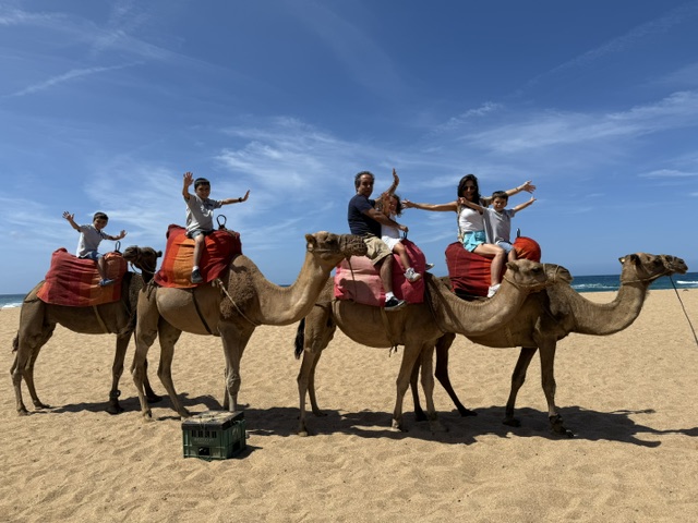 Their adventure continued with nature and excitement. At Cap Spartel, where the Mediterranean meets the Atlantic, they gazed from the cliffs across to Spain and Gibraltar. Seeing the Yam Hagdol again from a different angle was truly breathtaking and special. The nearby Caves of Hercules fascinated everyone with their legendary silhouette resembling the map of Africa. Later, the family set out on ATVs along the coastline, racing through forest trails with the sea beside them. The grand finale was a camel ride along the Moroccan beach, the children squealing with delight as they swayed atop these gentle giants.