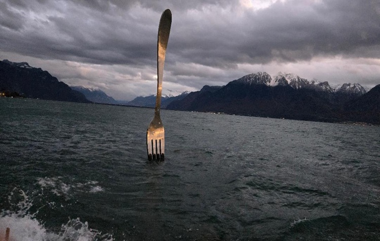 The iconic Alimentarium Fork rising from Lake Geneva in Vevey. Photo: New York Jewish Travel Guide